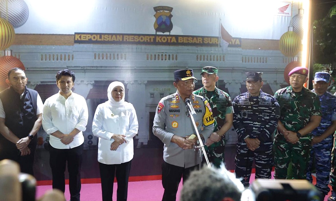 SURABAYA – Menjelang pergantian Tahun Baru 2026, Kapolda Jawa Timur Irjen Pol Nanang Avianto bersama jajaran Forum Koordinasi Pimpinan Daerah (Forkopimda) Provinsi Jawa Timur melakukan pemantauan langsung di sejumlah titik pengamanan di Kota Surabaya, Rabu (31/12/2025) malam.